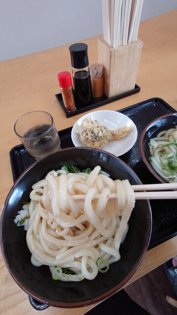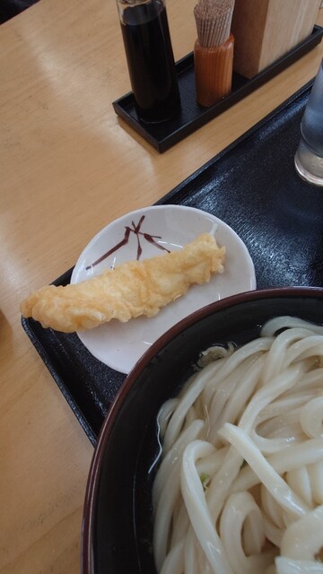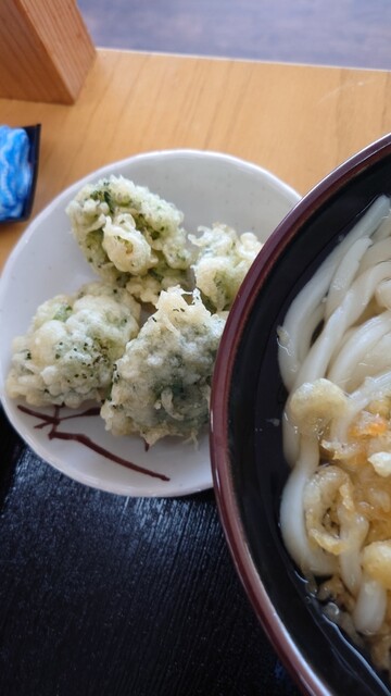 めん舟で冷かけ二玉、青とう醤油うどん二玉冷たいの、イカ天、1090円也paypay払い