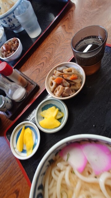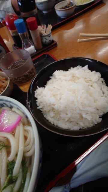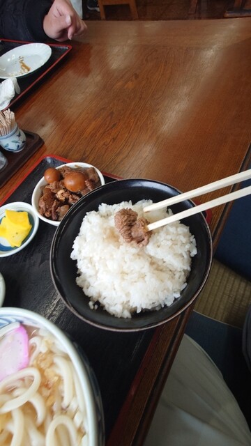つるぎで丼飯、かけ二玉、漬物(サービス)、百花の炊いたん、700円也