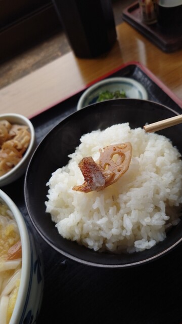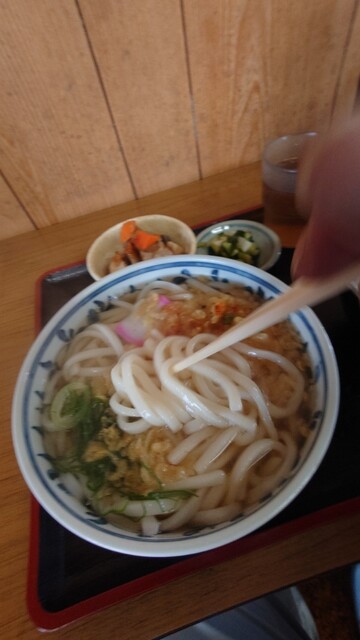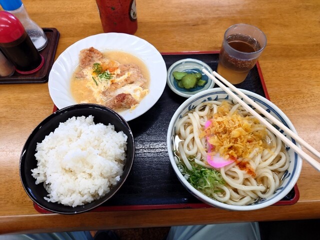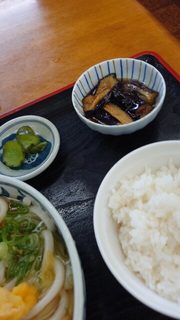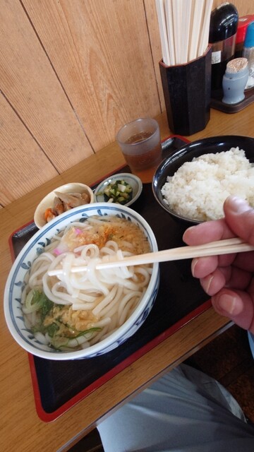 久しぶりのつるぎで丼飯、かけ二玉、小鉢、漬物(サービス)、700円也