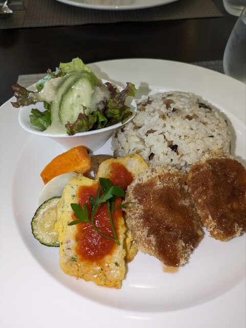 今月の「よくばりプレート」は、新玉ねぎのスープ、春キャベツのメンチカツとカジキのピカタトマトソース、きのこのピラフ♡