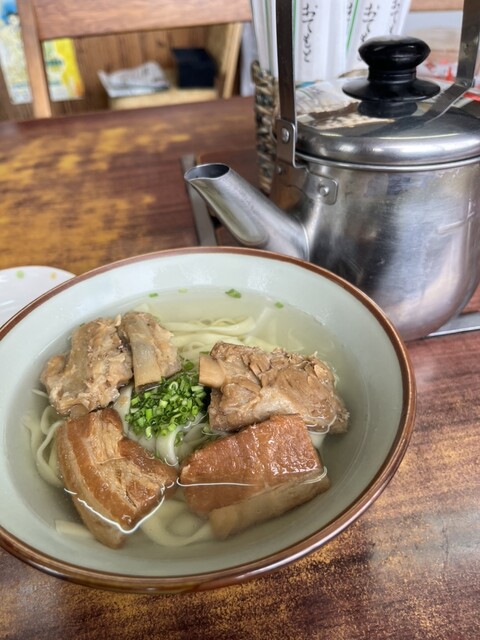 出汁がやかんに入っていて、自分で入れるタイプです。出汁が美味いです。ソーキ、三枚肉美味いです。コーレーグース、紅生姜を入れて、これまた美味い。ごちそうさまでした。