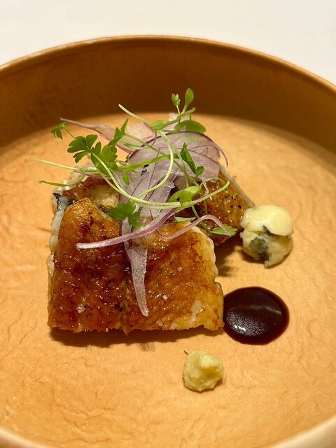 ソース3種はフルムダンベールのソース、ラディッシュとソーテルヌ、赤ワインソース。下にはうなぎの肝のなめろう。身も美味いけどこのなめろうが驚愕の美味いしさでした。ソース、身、なめろう、組合せによる変化で飽きません。