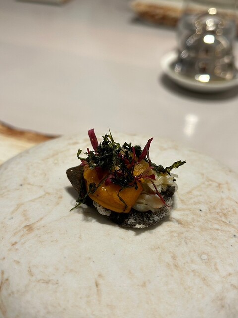 ⚫︎アミューズ、雲丹、下には海苔を練り込みザクっと揚げた葛粉のチップス