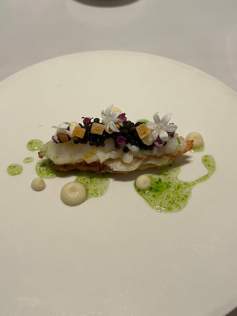 海老のネットリ、ガレットのザク、ほっくりとした食感がなんとも言えません。キャビアの塩気と穂紫蘇の香りも良いアクセントで、全てが過不足ない、