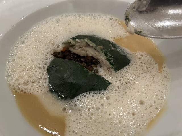 豆乳のソースと海老芋の滑らかさがとてもよく合います。これは濃厚な白ワインと珠玉のマッチです。