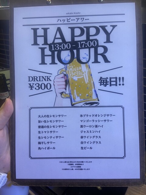 卓上に置いてあったポップを見たら、毎日ハッピーアワーをやっているそう!13:00-17:00はお得にアルコールメニューが飲めるみたいなので、今度は昼飲みで利用すると決めました☺️