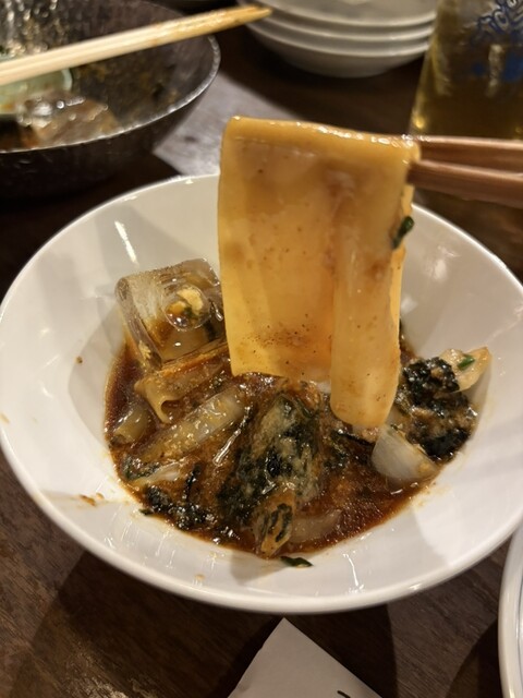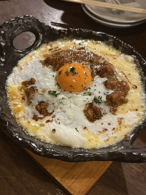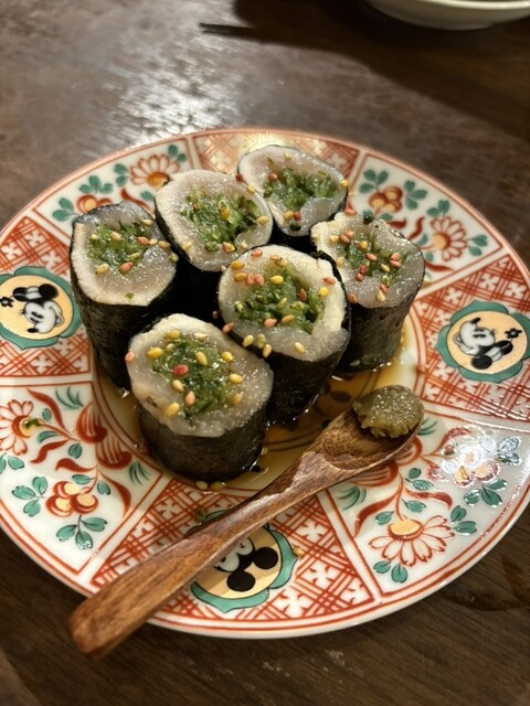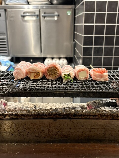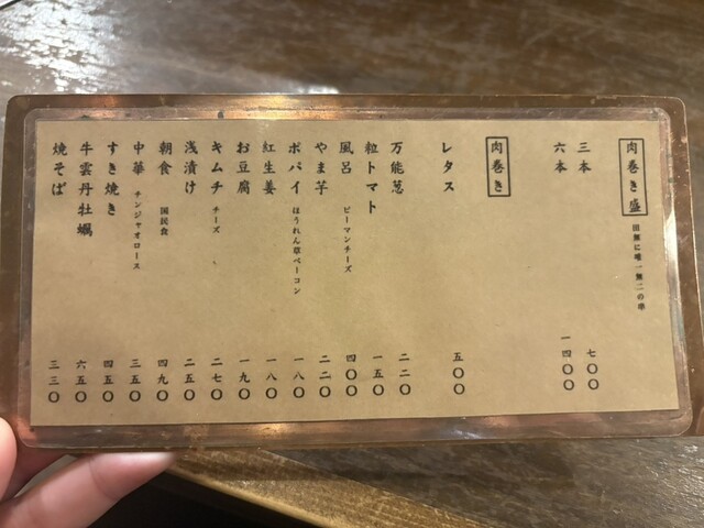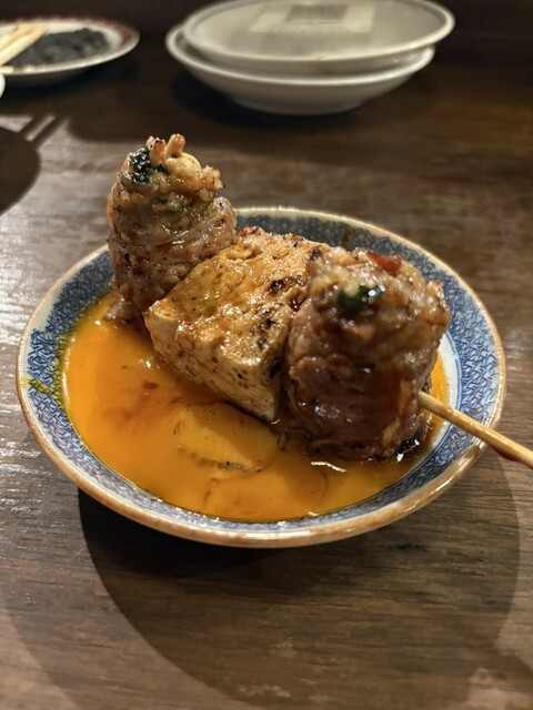 種類豊富な肉巻きはメニューのネーミングからしてユニーク。「風呂」「朝食」「中華」など、どれも気になってしまいます。そんな中、私たちがオーダーしたなかでも特におすすめなのが「すき焼き」!えのきの肉巻きと絹ごし豆腐が一つになった、まさしくすき焼きを再現した逸品なんです。甘辛いタレをまとったお肉や豆腐に卵黄をたっぷりつけて食べるのが絶品!