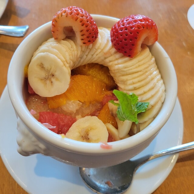 美味しい!バナナ、いちごに加えてグレープフルーツ、ピンクグレープフルーツ、夏みかん?がたっぷり入っていた。これだけで満足できる量ある。最高のメニュー、