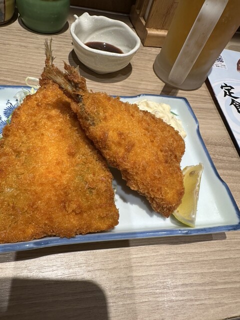 先ずは喉を潤し、選べるおかず定食とアジフライ2尾を注文…焼き魚と刺身をチョイス。メニュー写真と違いコンパクトな定食…あれって思いましたが…笑笑。刺身が美味しい…無茶苦茶美味しい。博多出身で色々魚は食べ歩きますがびっくり‼️美味い。チェーン店の味ではない。