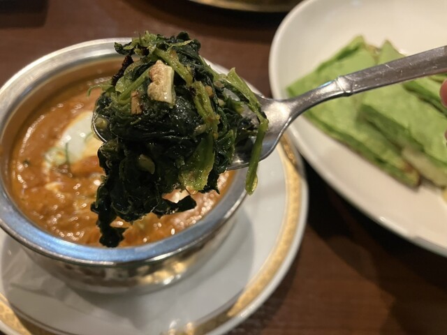 2種のカレー(チキンと豆カレー)のプレート、と、キーマカレー、グリーンチーズナン、を2人でシェア。