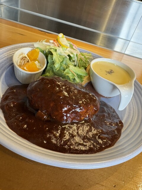 春日部店限定のてりトマバーガー和牛パティ、ポリスランチのプラス500円で、サラダ、ホワイトコーンのポタージュ、本日の一品はローストビーフ、ポテト。