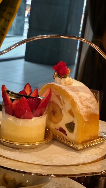 相方のミラマーレはホテルの名前の付いたロールケーキです。中はたっぷりのクリームとバナナとキウイ、苺等のフルーツが入っていて、大きく食べ応えもしっかり有りそうです。苺のタルトの中はカスタードクリームが入っていて、こちらもとても美味しかったそうです☺
