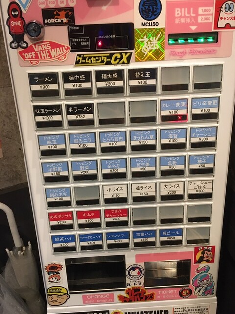 22時半に入店したのですが満席で10分程待つことになりました。席が空いたので味玉ラーメン(1000円)+麺大盛(200円)の食券を購入して着席します。10分ほどでラーメンが提供されましたが調理工程を眺めていると玉子を包丁ではなく糸で半分にしていました。