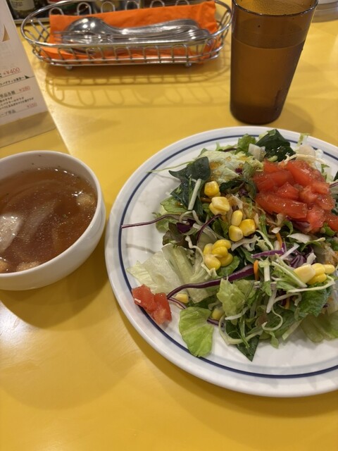 外で少し並びました。前に6人程。やっと着席して塩バジリコとスープサラダセットを注文しました。10品の野菜サラダがとてもたっぷりで、2人で分けてもいい量です。すぐにパスタも出てきました。生麺が素晴らしく美味しい。食べ応え充分。