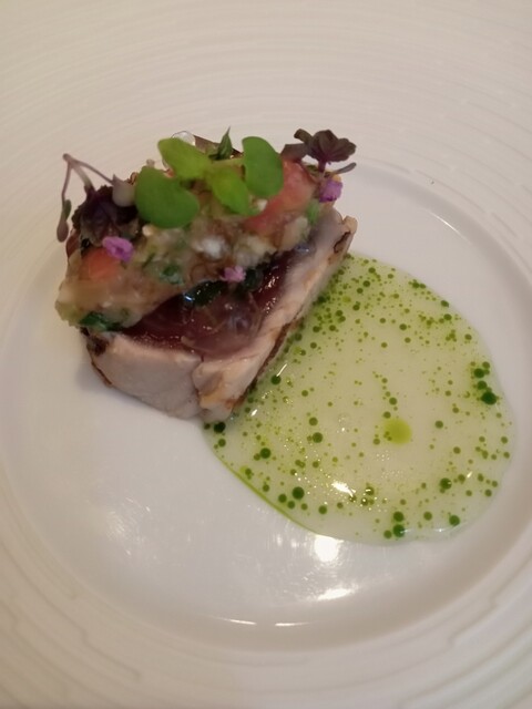 山形の出汁を意識したネバネバ系野菜とトマトとローズマリーソースを添えて