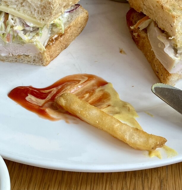 たまらず喰らい付く、美味すぎる!ターキーとスライスチーズ、コールスロー?付け合わせのポテトフライがやはり多いw マスタード貰ってケチャップと混ぜて食べると美味さが増す。