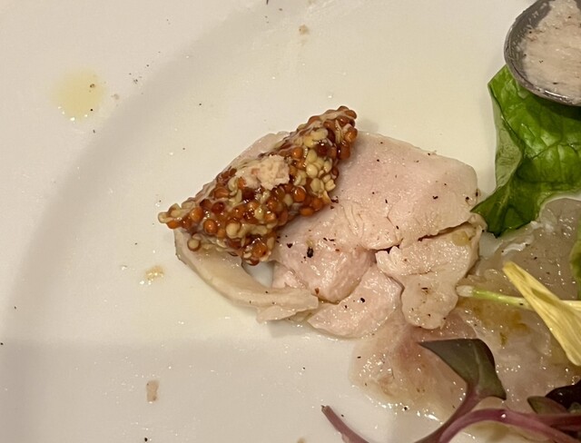 まず、スパーリングワインで改めて乾杯。本日の前菜の盛り合わせ。ポテトサラダとかハム、サラミ、鶏のハム?には粒マスタードを貰って食べたら、やはり美味しかった!