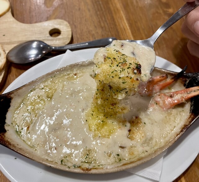 白ワイン、蟹味噌のグラタンとチーズの盛り合わせ