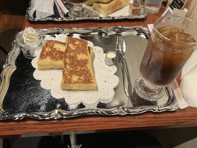 まずセットに選んだアイスコーヒーをいただくと、結構酸味を感じる味わい(中煎り?)です。そしてフレンチトーストは焼きたてホカホカ、中とろーりで、これは酸味感じるコーヒーの方が相性が良いと感じます。お供はホイップとシナモンパウダー、時々味変するのにちょうどよいです。メープルなどのシロップは付いてませんが、フレンチトースト自体の甘さが程良いのでなくても十分美味しかったです。