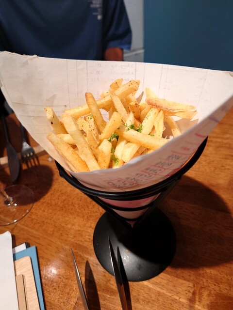 ポムフリット、本日のカルパッチョ、牛すじマカロニグラタン、鶏もも肉のカリカリ焼きとアルコール飲料をいただきました