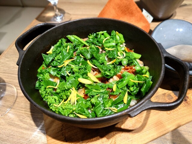 ・さて、いつも楽しみな本日の〆のご飯は『アサリと菜の花、ドライトマトの〆ご飯』でした。まずアサリの出汁がしっかり効いています。ドライトマトから出たトマトの甘みとわずかな酸味、ものすごく濃くトマトの味が感じられます。菜の花は目にも鮮やかなグリーンんで、色味も華やかで春を先取りで感じられて、食味としては程よい苦味でアクセント。まるでトマト味ベースのリゾットをいただいているかのような統一感のある〆ご飯でした。