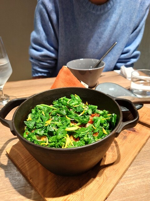 ・冷前菜はメニュー表には載っていませんでしたが、手書きの追加メニューに『西洋タンポポと仔羊のタンとヘーゼルナッツ』があり、注文。少し苦味のあるシャキシャキした西洋タンポポの茎と柔らかい仔羊のタン、ヘーゼルナッツの香ばしい食感の違いがが楽しめる一皿でした。