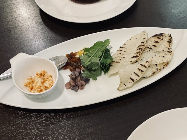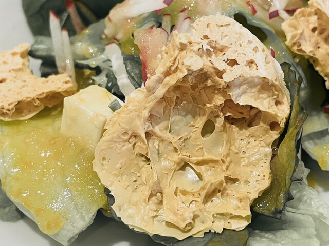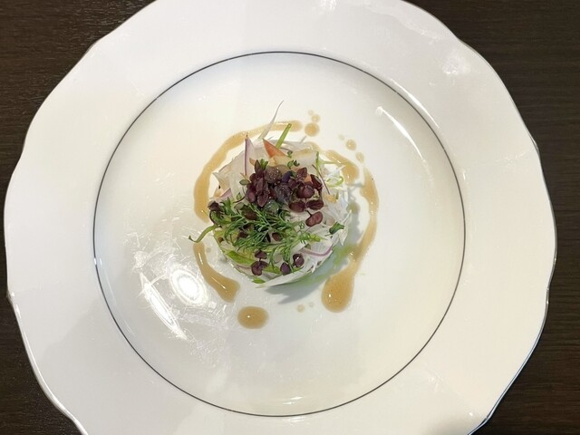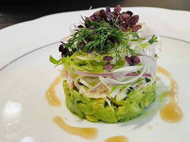 これまた、淡いグリーン系の色彩が白いお皿に映える。美しい。アミューズより、しっかりした味付けだが、やや酸っぱい、これぞ、オードブルって言う味わい。アボカドが味付けが絶品でした。