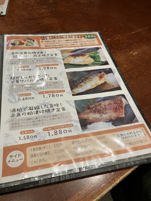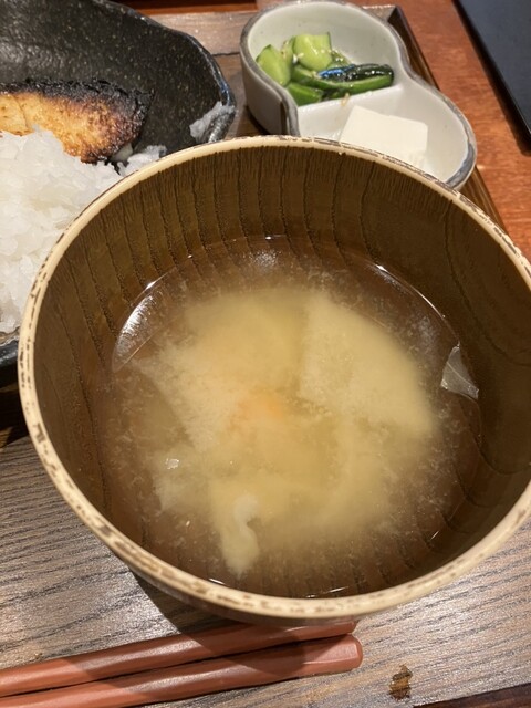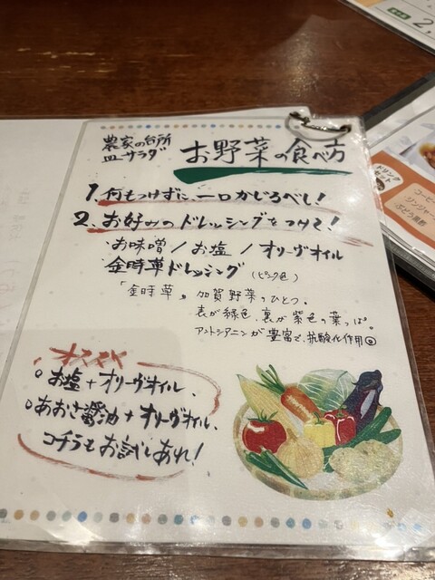 「春の定番の焼き魚!黒ムツ 西京焼き定食」に「10種のこだわり野菜の盛合せ」を付けてチョイス!同行者は「真アジの3種味比べ定食 フライ、竜田揚げ、生姜焼き」と野菜盛り合わせ。定食には、ご飯、生卵、豆腐、お新香、お味噌汁が付きます。ご飯とお味噌汁はおかわり無料。生卵は6種類から選べます。今回は、「ゆずたま」と「幸せの青い卵」でした。お店自慢の生卵はとても新鮮で美味しいですね。ご飯のおかわりを我慢するのが難しいかも。農家の台所という店名から想像できる通り、野菜の美味しさは格別です!これまでにない味わいを楽しむことができます。食後に生姜風味のほうじ茶で、ヘルシーさがさらにアップします。