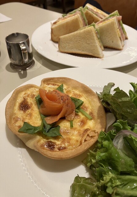 銀座駅から徒歩5分ほどの創業1911年の有名店。キッシュとコーヒーのセットで、サーモンとほうれん草のキッシュと「パウリスタオールド」、クラブサンドイッチのコーヒーセットで「森のコーヒー」をチョイス!どちらのセットもコーヒーのお代わりができます。種類変更もOK。キッシュはスモークサーモンの風味と塩加減、チーズのコクとのバランスが抜群で卵と生クリームとの相性も最高。生地のサクサクの食感を楽しめます。サンドイッチは厚みのあるベーコンとトマトとレタスがベストマッチ。野菜の新鮮さとパンの美味しさが伝わる味わいで食べやすいサイズ。パウリスタオールドの香りと深みは格別で珈琲好きにとっては至福の味わい。まさに「オールド」と呼ぶに相応しい伝統を感じることができます。森のコーヒーはマイルドで香り立つスッキリとした印象。1杯目がオールドなら2杯目としておすすめです。歴史ある店内のBGMはジャズ。落ち着いた雰囲気でゆっくりと過ごすことができます。1978年にジョン・レノンとオノ・ヨーコも訪れたという銀座の有名店で心から寛ぐことができました。