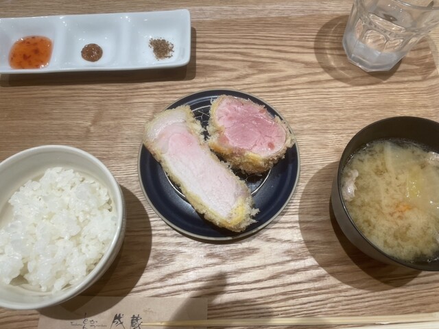 前菜が終わるとご飯と豚汁が到着し、いよいよとんかつとご対面。そうそう、このビジュですよ!とんかつとは思えないこの肉の断面。まずはロースを何も付けずガブリ。うめぇーーー!一口で簡単に髪切れるし、肉も甘みと旨味が詰まってるーーー!次にお塩、そして塩➕ごま油も香ばしさが合わさって本当に何回も噛み締めたくなる旨さです。