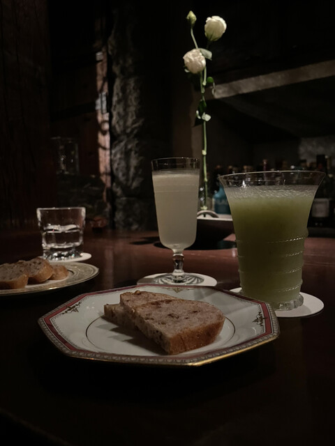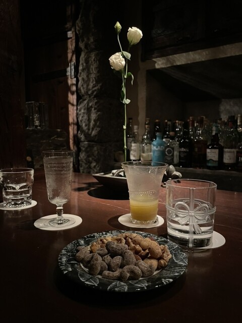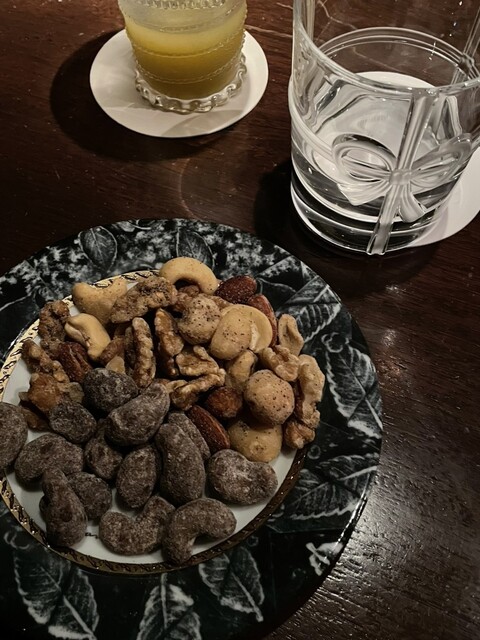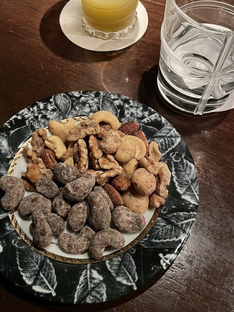 おつまみには、薄切りのパンとコーヒーシュガーでコーティングされた珍しいナッツ、そしてしょっぱめのミックスナッツをいただきました