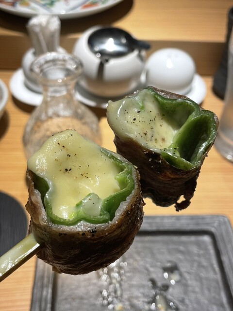 豚で巻かれていてふわふわ、食べやすく工夫された串。