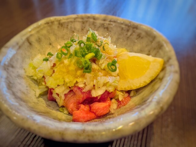 ネギ塩タンユッケも注文しましたが、霜降りたっぷりのタンの食感が最高。ネギ塩がたっぷりでちょっぴり辛いと思いましたが、美味しかったです。