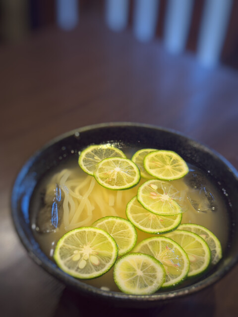 冷麺はスダチたくさんの成岡冷麺。太い麺で噛み応えがあって美味しい。お酢がついてこないので、良くも悪くも酸味は全くないです。