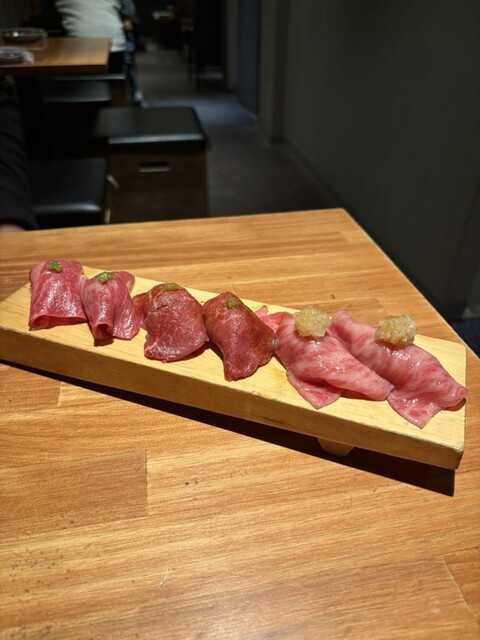 贅沢な【肉寿司3種盛り】(サーロイン・ヒウチ・シンシン)は一貫ずつ違う旨みが広がって、まるでお肉の食べ比べコース。