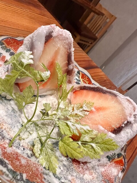 〆にいただいた苺大福はなんとその場で大福の生地を作ってフレッシュな大ぶりの苺にお餅を纏わせているそうです。