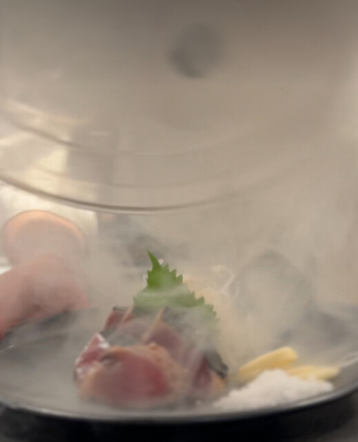 続く「炙りたて!本日の菊焼き」は目の前で藁を焼き、遠火の強火で鰹を焼き上げる圧巻のパフォーマンス。鰹の皮の焼き目の香ばしさとジューシーなふっくら感のコントラストが絶妙。個人的なハイライトは目の前で立ち上る藁の煙が食欲をそそり、ひと口で口中に広がる香ばしさと濃厚な旨味に思わず唸りました。
