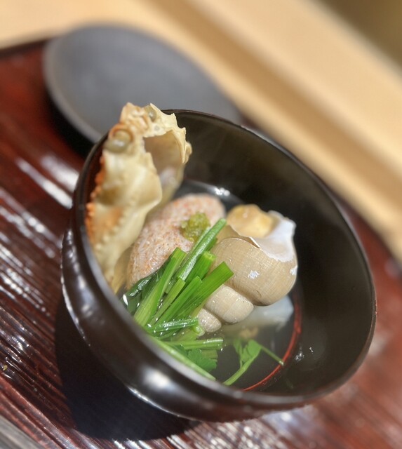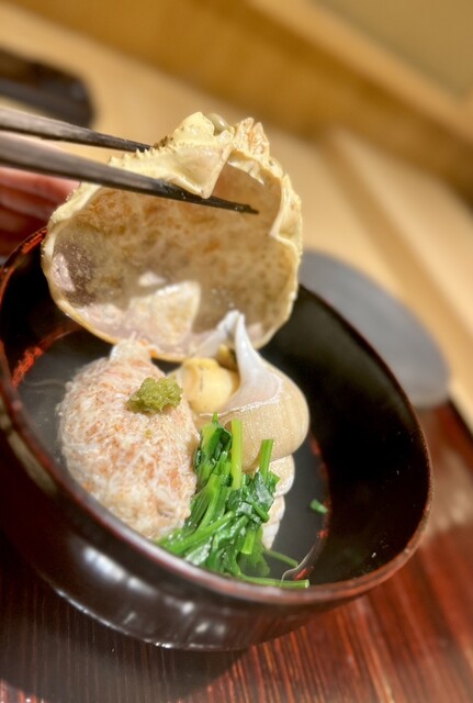 氷見の鰆はマルドーの塩でいただき、素材の良さが際立ちます。ミネラル感のある塩が身の甘みを引き出し、シンプルながら記憶に残る味わい。海老芋の唐揚げは外は香ばしく中はほくほくで、冬らしい満足感があります。終盤に登場した鳥取県境港市の松葉蟹は、派手さはないものの、しっかりとした旨みでコースを支えていました。