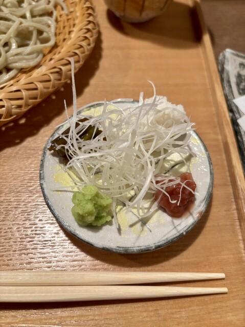 わさび、梅、辛味大根、ねぎ、茎わさびが少しずつついて、せいろ一枚で色々な薬味を味わえるし、さらに人気の野菜天ぷらまで楽しめるせいろそば☘️