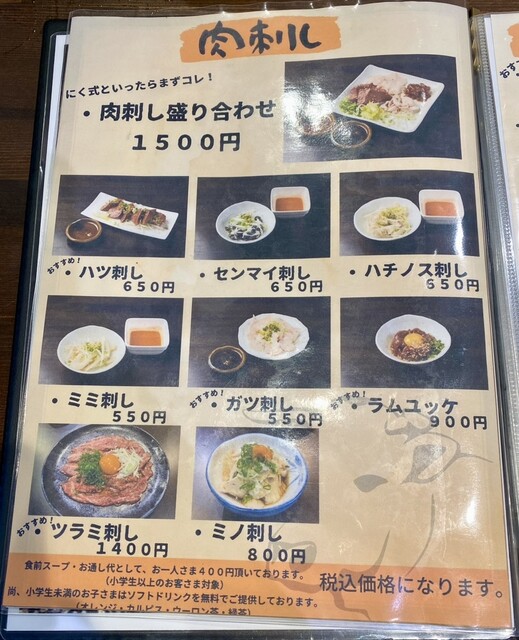 ・カイノミうす、カイノミあつ、ハラミうす、ハラミあつ、サガリ、上カルビのラインナップ。