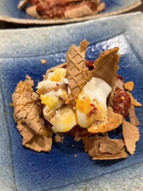 →中から半熟卵を垂らす→お箸でまぜませ。