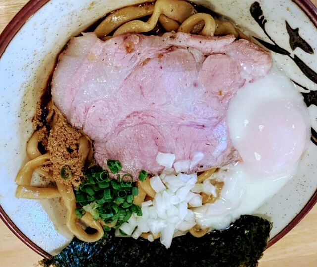 元祖宮古島まぜそばに、温玉プラスで頂きました。最初はそのまま、次は温玉絡めて、その次は七味を少々 最後にご飯混ぜて完食!太麺で美味しかったです。次回、宮古島に行ったら他もメニューも美味しそうなのでの食べたいです