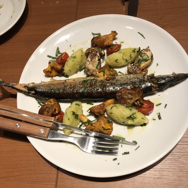 秋刀魚と季節野菜を低温調理器具でゆっくりローストした絶妙な逸品。骨までいける。白ワインを入れよう。食材も素晴らしい。野菜本来の甘味、旨味、ポルチーニの香り、岩塩のコク、最高だ。