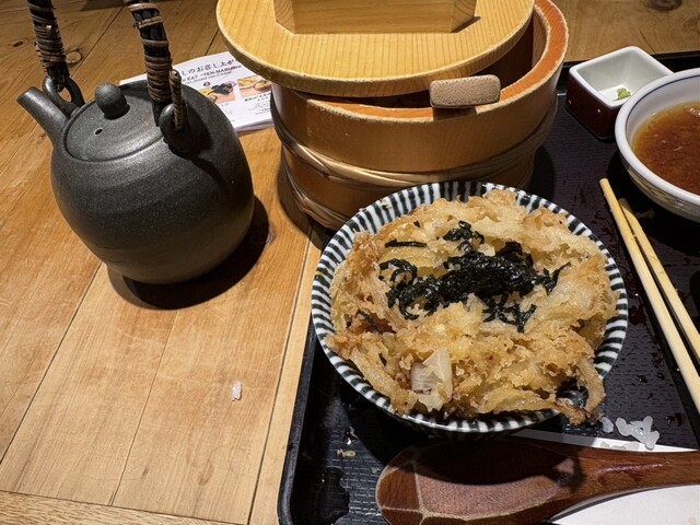 鰹出汁の汁を貰い、残してたかき揚げをご飯に乗せて、出汁を注ぐ。