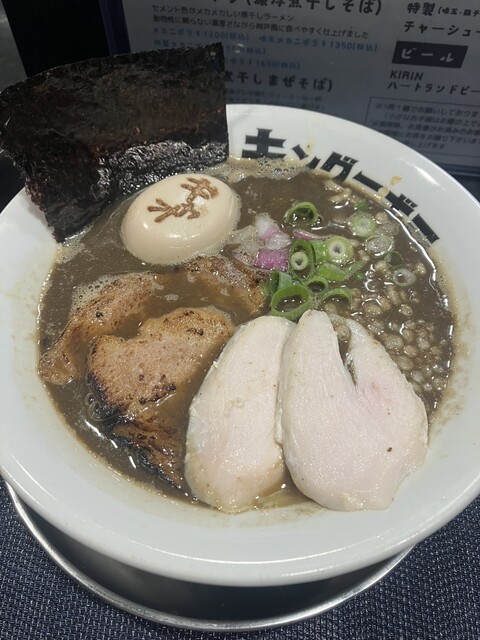 このどろっとしたスープを中太縮れ麺がまとい、すすると同時に煮干しの風味が口内に広がります。好きな人にはたまりません。逆に煮干し苦手な人はキツイかも笑