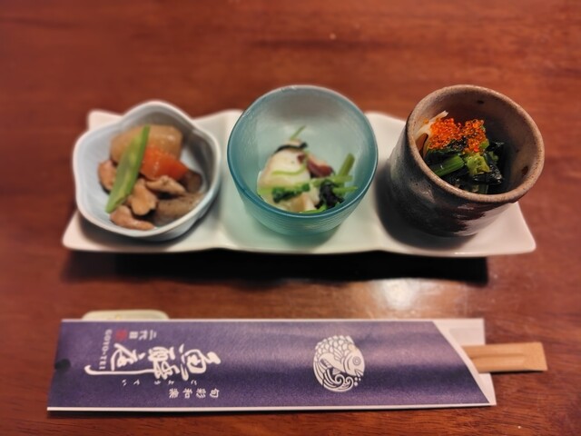 綺麗な器に入った3種類のお通しは見た目だけでなくお味も間違いなし。