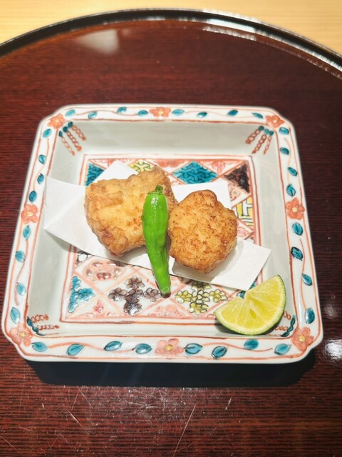 卓上にある原了郭の調味料が気になりまして身が締まり脂の乗った寒ぶりに粉山椒、肉厚でふわふわのジューシーなサクッと揚がったホタテ貝柱フライにゆず辛をつけて頂いても美味しかったです