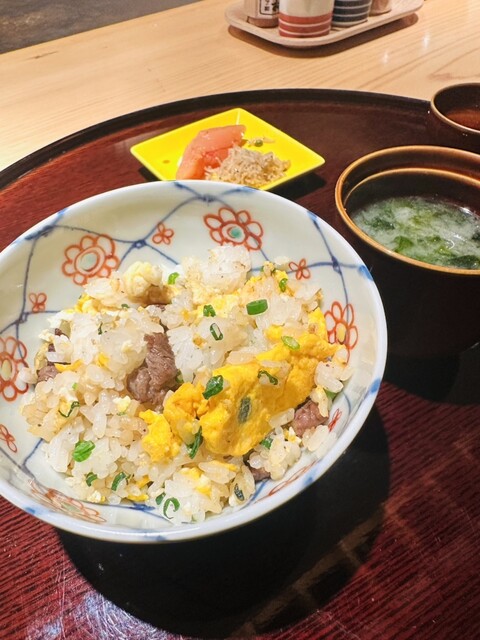 カニ炒飯と一緒にいただく、お肉や明太子...あさりのお味噌汁。最高の〆です。