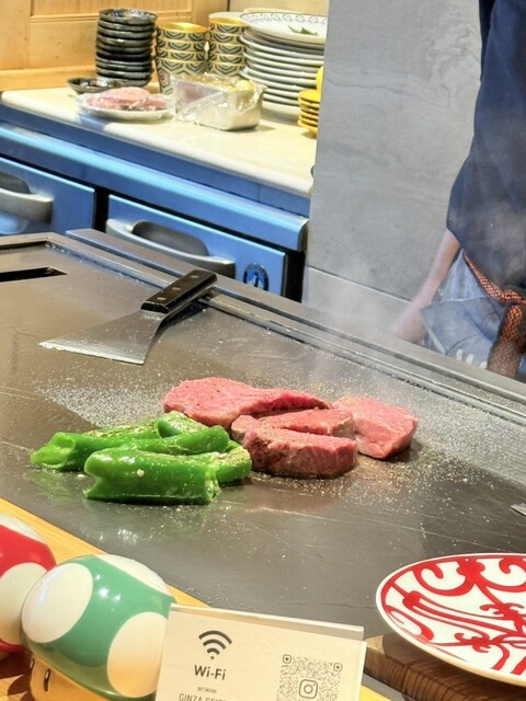 店内にはルイ・ヴィトンやエルメスの器が並び、目の前の鉄板で調理されるライブ感も魅力的。大将の笑顔と程よい距離感の会話も心地よく、銀座らしい素晴らしい時間を過ごせます。