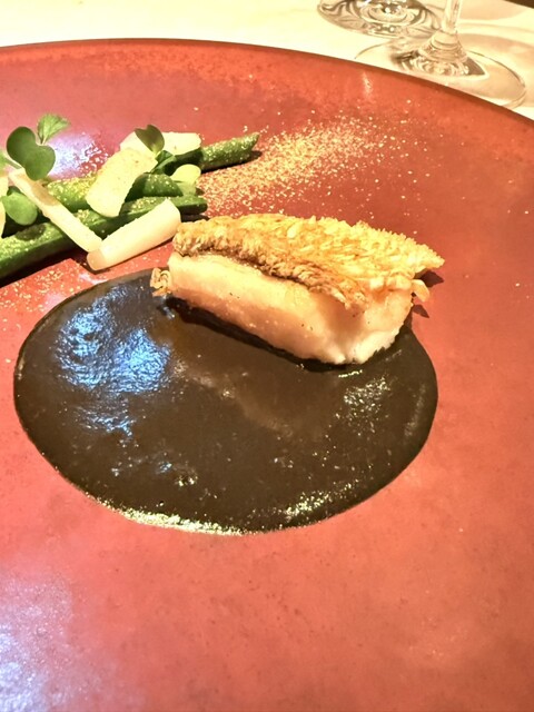 ・甘鯛の鱗焼き、アメリケーヌベースのイカ墨ソース